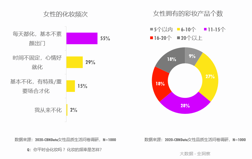 CBNData《報告》顯示,越來越多的女性開始關注對自己外在形象的話語權(quán),近年來彩妝消費需求強勁。55%的女性每天化妝,64%的女性擁有10件以上的化妝品。