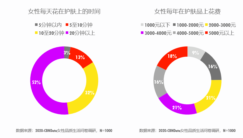 CBNData《報告》指出,近兩年內(nèi),護膚、口服美容等與顏值相關的品類帶動萬億級的消費增長,其中洗臉儀、按摩儀、蒸臉儀等高科技美容儀備受青睞。55%的女性每年護膚品花費超過3000元,超過半數(shù)的女性每天花在護膚上的時間超過20分鐘。