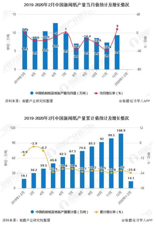 2020年1-2月中國(guó)新聞紙產(chǎn)量超14萬噸