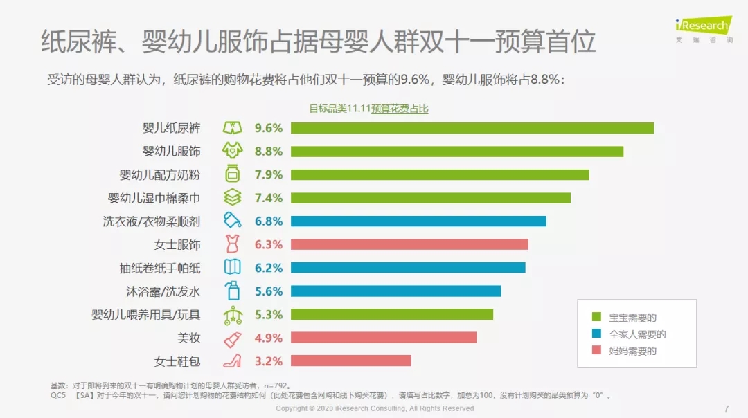 據(jù)艾瑞咨詢《2020年雙十一母嬰品類消費行為前瞻洞察》報告顯示,在對雙十一有明確購物計劃的母嬰人群中,紙尿褲和嬰幼兒服飾占據(jù)母嬰人群雙十一預(yù)算首位,其中,紙尿褲的購物花費將占到他們雙十一預(yù)算的9.6%,嬰幼兒服飾將占8.8%。