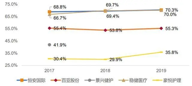 從整體的費(fèi)率來看,穩(wěn)健醫(yī)療最高為37.5%,百亞股份次之為32.0%,豪悅護(hù)理最低為11.1%。拆分來看,擁有自主品牌的穩(wěn)健醫(yī)療和百亞股份 2019年銷售費(fèi)用率分別為 30%和 27%,恒安國(guó)際次之為 14%,做代工業(yè)務(wù)的豪悅護(hù)理僅為5%。管理費(fèi)用率方面,恒安國(guó)際最高,2019年為 5.7%,豪悅護(hù)理最低為1.8%。研發(fā)費(fèi)用率方面,豪悅護(hù)理和穩(wěn)健醫(yī)療最高,2019年均為 3.4%。