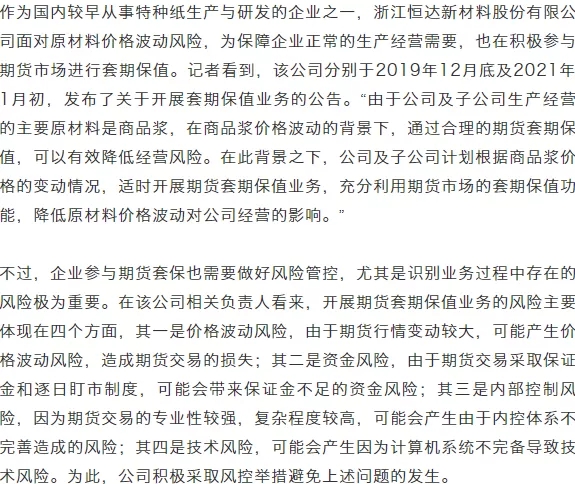 “為了規(guī)避突發(fā)事件對(duì)紙漿需求的影響,國(guó)貿(mào)紙業(yè)在去年1月份通過(guò)賣出套保鎖定了在手貨物的預(yù)期利潤(rùn)。同樣的,在4月份國(guó)外疫情開始暴發(fā)的時(shí)候,出于對(duì)后市海外需求銳減的考慮,國(guó)貿(mào)紙業(yè)也及時(shí)通過(guò)套期保值對(duì)沖了在途貨物的價(jià)格風(fēng)險(xiǎn)。”