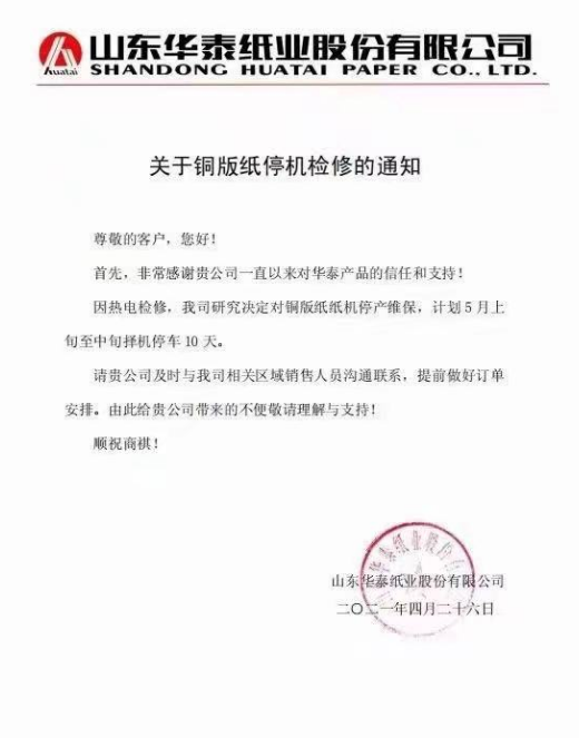華泰紙業(yè):因熱點檢修,我司研究決定對銅版紙紙機(jī)停產(chǎn)維保,計劃5月上旬至中旬擇機(jī)停車10天。
