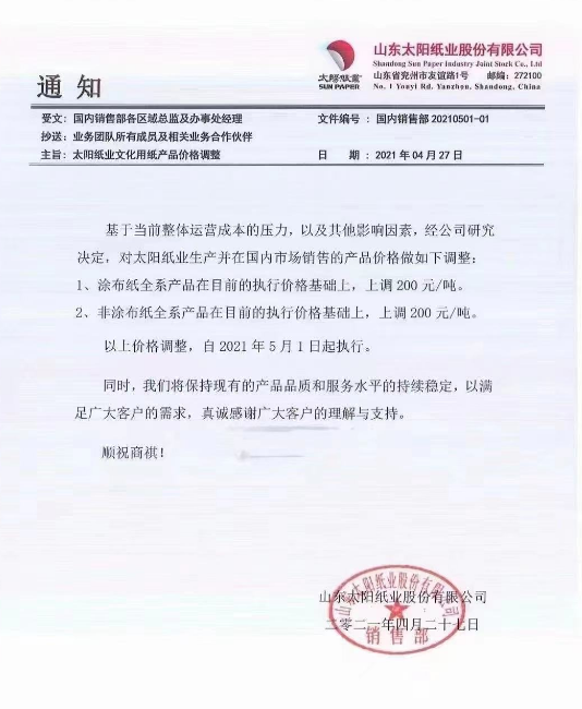 APP文化用紙:5月1日起,針對金東、金海所生產(chǎn)的各系各紙種、克重紙品價格在2021年4月基礎(chǔ)上調(diào)漲200元/噸(含稅)。