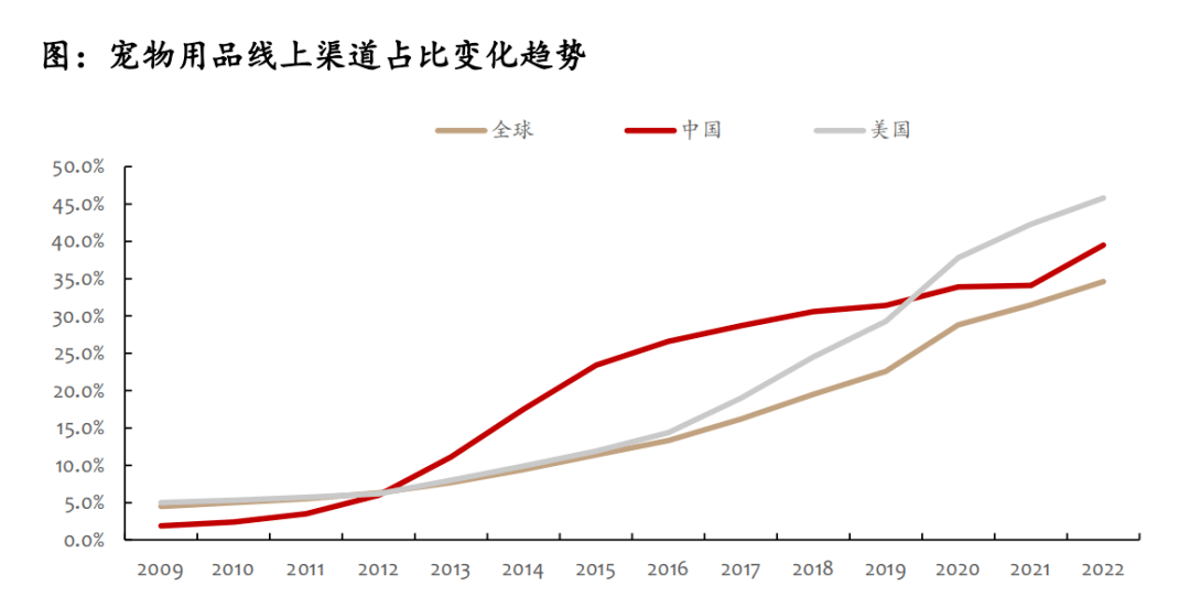 隨著電商平臺的迅猛發(fā)展以及線上購物的便捷性,寵物用品線下銷售渠道占比有所下降,而線上渠道占比持續(xù)提升。根據(jù)歐睿國際的數(shù)據(jù)顯示,全球寵物用品線上渠道占比由2013年的7.7%增長至2022年的34.6%,13-22年規(guī)模CAGR高達18.17%。