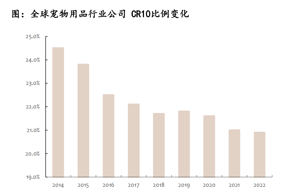 根據(jù)歐睿國際的數(shù)據(jù),從公司層面來看,2022年全球寵物用具CR10(最大的10個寵物用品公司之和所占的比例)僅為20.9%,2021年CR10為21.0%,而2015年CR10為23.8%,整體來看全球寵物用品行業(yè)公司CR10呈下降趨勢;2022年CR3僅為9.9%,市場份額top3分別為Central Garden& PetCo、Nestle SA、ElancoAnimal Health Inc,市場份額分別為3.6%、3.4%、2.9%。