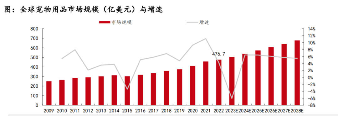 根據(jù)歐睿國際數(shù)據(jù)顯示,2019-2021年寵物用品市場增速分別為4.76%、9.28%、11.16%。2022年增速有所放緩,僅為4.28%,全球寵物用品規(guī)模達477.68億美元,2019-2022年復合增長率為8.20%,預計2022-2028年寵物用品復合年均增長率為3.03%,寵物用品市場規(guī)模將達到677.25億美元。