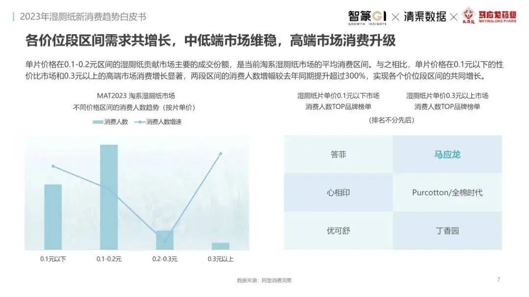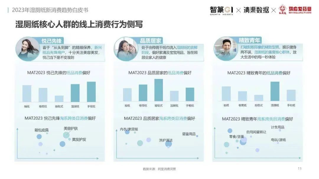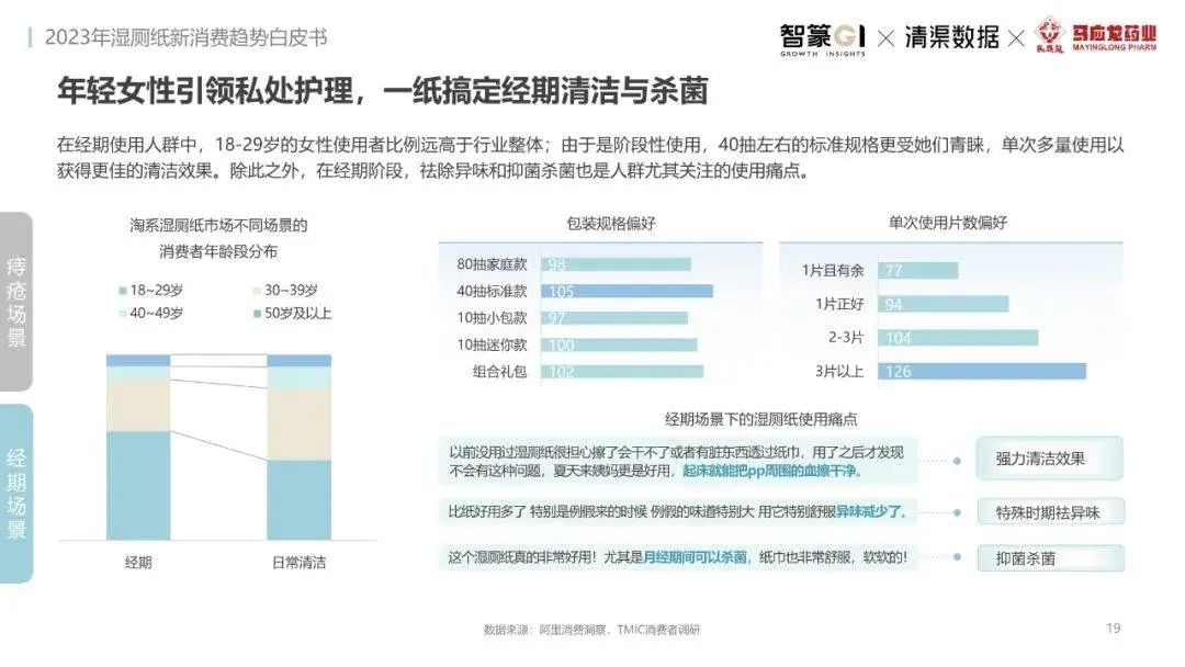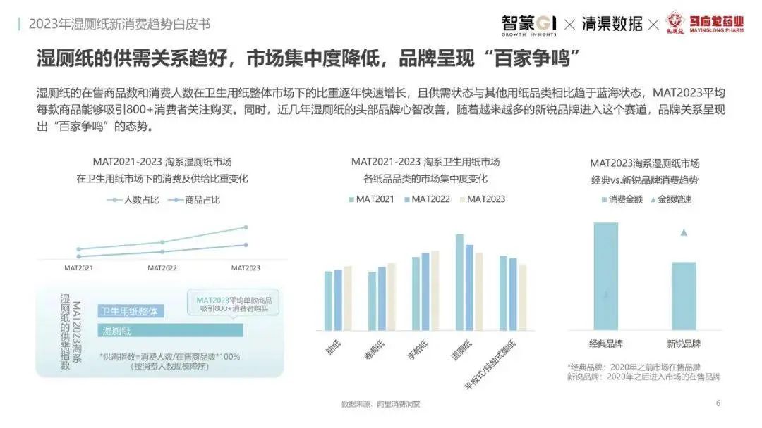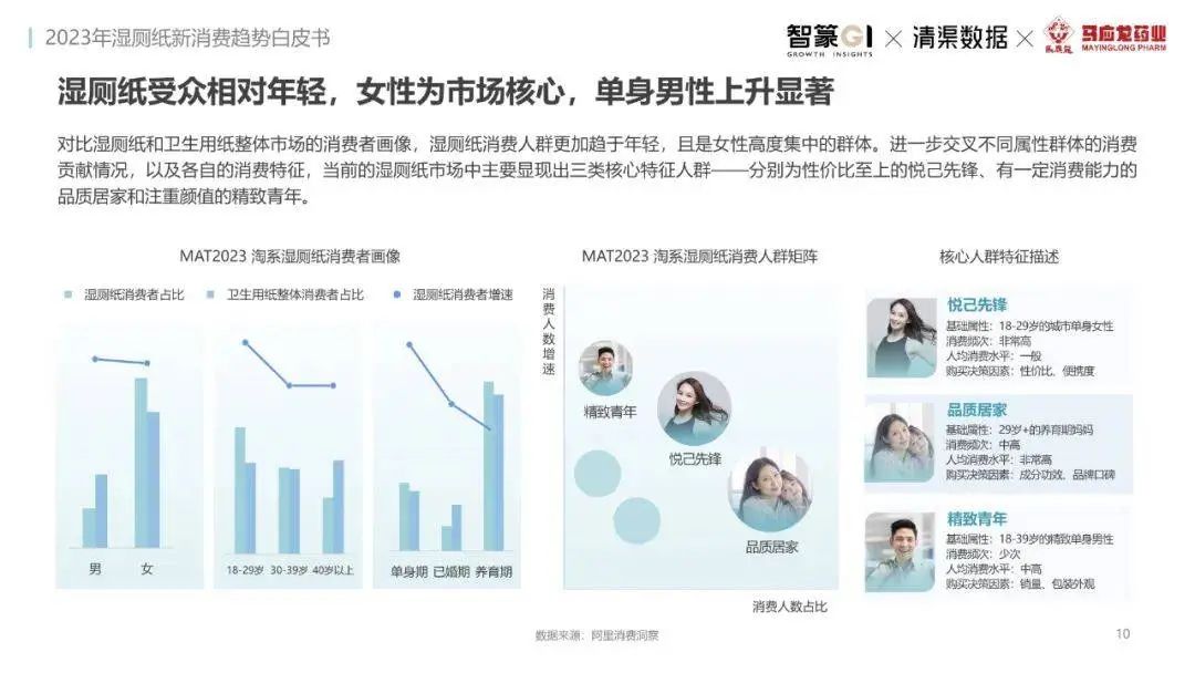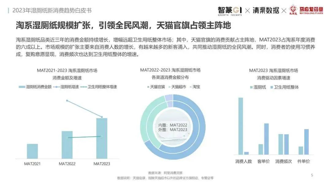淘系濕廁紙品類近三年的消費(fèi)金額持續(xù)增長(zhǎng),增幅遠(yuǎn)超衛(wèi)生用紙整體市場(chǎng),其中,天貓官旗的消費(fèi)責(zé)獻(xiàn)占主陣地,MAT2023占淘系年度消費(fèi)的六成以上,市場(chǎng)規(guī)模的擴(kuò)張主要來(lái)自消費(fèi)人數(shù)的增長(zhǎng),有越來(lái)越多的新客涌入,共同推動(dòng)溫廁紙的全民風(fēng)潮,同時(shí),消費(fèi)者的使用習(xí)慣養(yǎng)成,復(fù)購(gòu)意愿顯現(xiàn),消費(fèi)頻次也達(dá)到衛(wèi)生用紙整體的增速。