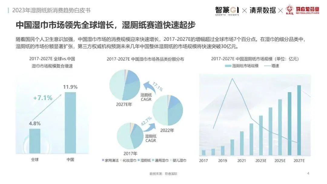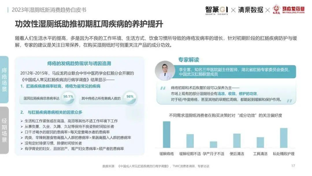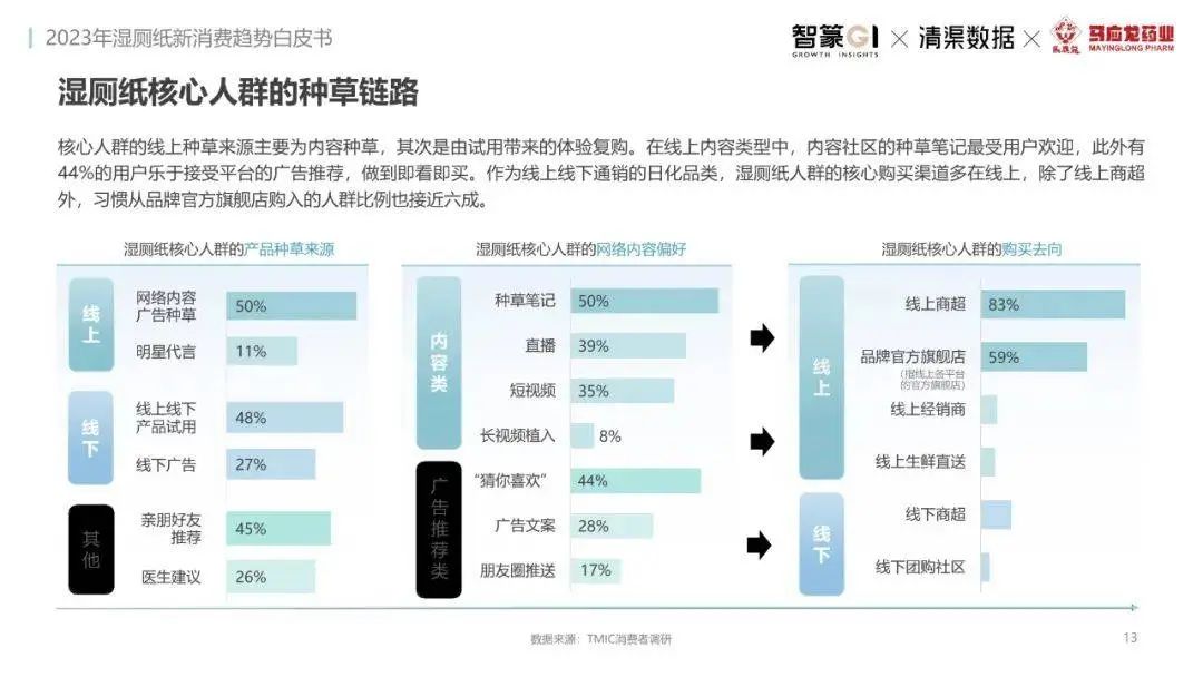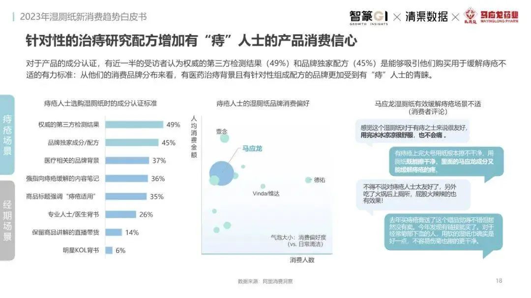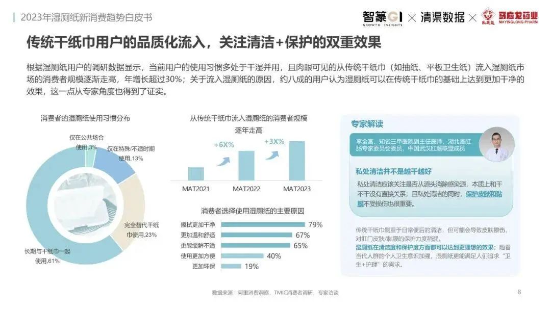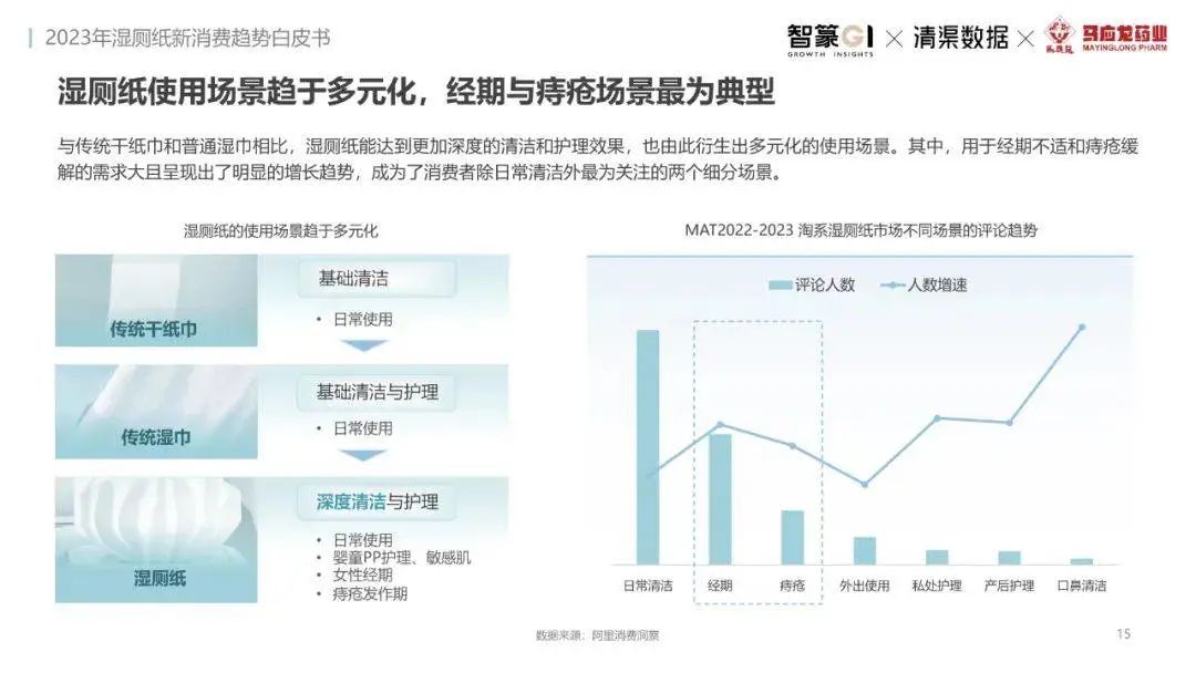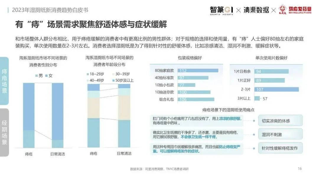 淘系濕廁紙品類近三年的消費(fèi)金額持續(xù)增長(zhǎng),增幅遠(yuǎn)超衛(wèi)生用紙整體市場(chǎng),其中,天貓官旗的消費(fèi)責(zé)獻(xiàn)占主陣地,MAT2023占淘系年度消費(fèi)的六成以上,市場(chǎng)規(guī)模的擴(kuò)張主要來(lái)自消費(fèi)人數(shù)的增長(zhǎng),有越來(lái)越多的新客涌入,共同推動(dòng)溫廁紙的全民風(fēng)潮,同時(shí),消費(fèi)者的使用習(xí)慣養(yǎng)成,復(fù)購(gòu)意愿顯現(xiàn),消費(fèi)頻次也達(dá)到衛(wèi)生用紙整體的增速。