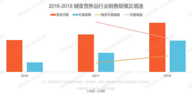 據(jù)CBNData數(shù)據(jù)顯示,2016—2018近三年間無(wú)論是在淘寶天貓還是天貓平臺(tái)上,輔食營(yíng)養(yǎng)品的銷售規(guī)模都是在穩(wěn)步提升,特別是天貓平臺(tái)增速迅猛,且市場(chǎng)占比逐年大幅提升,2018年天貓平臺(tái)在整體淘系營(yíng)養(yǎng)品銷售份額過(guò)半,遠(yuǎn)遠(yuǎn)超過(guò)50%。