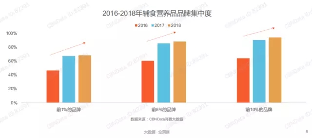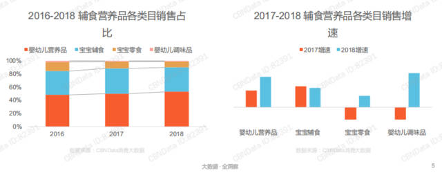 目前輔食營(yíng)養(yǎng)品大致分為嬰幼兒營(yíng)養(yǎng)品、寶寶輔食、寶寶零食、嬰幼兒調(diào)味品四個(gè)子品類。從上圖我們不難看出,從2016年—2018年嬰幼兒營(yíng)養(yǎng)品從不足50%提升至50%以上,銷售占比逐年提升,發(fā)展態(tài)勢(shì)一片大好。一方面,“生命早期1000天營(yíng)養(yǎng)健康”在政府層面的確立,更是為嬰兒營(yíng)養(yǎng)品打開(kāi)了市場(chǎng)的大門;另一方面,在優(yōu)生優(yōu)育觀念的影響下,孕育下一代成為每個(gè)家庭的頭等大事,嬰幼兒營(yíng)養(yǎng)品的市場(chǎng)占比與熱度日益提升。